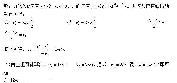本题考查匀变速直线运动推论的应用,从A到B应用速度与位移的关系列公式,同理C到B列公式,根据平均速度公式可求得AB、BC中间时刻的瞬时速度,再由几个公式联立求解
