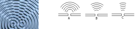 3、填空题 如右图所示,为水中两个振动情况完全相同的波源所形成的图样,这是水面波的____________现象;下图中的A、B、C是不同频率的水面波通过相同的小孔所能达到区域的示意图,则其中水波的频率最大的是_________图。