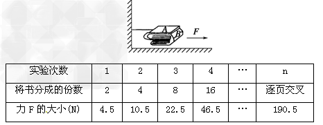 参考答案:解:(1)对表中数据分析可知:将书分成四份时,力F比前一次增加6 N,将书分成8份时,力F比前一次增加12 N,由此可知,每这样分一次,增加的力是上次增加的力的2倍,故将书分成32份,力F应比前