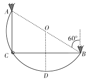 5、计算题 (14分)如图所示,将直径为2R的半圆形导轨固定在竖直面内的A、B两点,直径AB与竖直方向的夹角为60°。在导轨上套一质量为m的小圆环,原长为2R、劲度系数