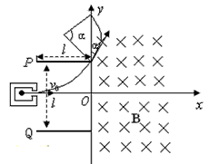 1、计算题 如图甲所示,建立Oxy坐标系,两平行极板P、Q垂直于y轴且关于x轴对称,极板长度和板间距均为l,第一四象限有磁场,方向垂直于Oxy平面向里。位于极板左侧的粒子源沿x轴间右连接发射质量为m、电量为+q、速度相同、重力不计的带电粒子在0~3t时间内两板间加上如图乙所示的电压(不考虑极边缘的影响)。已知t=0时刻进入两板间的带电粒子恰好在t0时,刻经极板边缘射入磁场。上述m、q、l、l0、B为已知量。(不考虑粒子间相互影响及返回板间的情况)