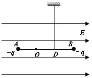 3、计算题  如图所示,绝缘轻杆长L=0.9m,两端分别固定着带等量异种电荷的小球A、B,质量分别为mA=4×10-2kg,mB=8×10-2kg,A球带正电,B球带负电,电荷量q=6.0×10-6C。轻杆可绕过O点的光滑水平轴转动,OB=2OA。一根竖直细线系于杆上OB中点D使杆保持水平,整个装置处在水平向右的匀强电场中,电场强度E=5×104N/C。不计一切阻力,取g=10m/s2,求:
