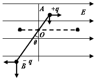 3、计算题  如图所示,绝缘轻杆长L=0.9m,两端分别固定着带等量异种电荷的小球A、B,质量分别为mA=4×10-2kg,mB=8×10-2kg,A球带正电,B球带负电,电荷量q=6.0×10-6C。轻杆可绕过O点的光滑水平轴转动,OB=2OA。一根竖直细线系于杆上OB中点D使杆保持水平,整个装置处在水平向右的匀强电场中,电场强度E=5×104N/C。不计一切阻力,取g=10m/s2,求: