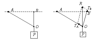 3、选择题 细线AO和BO下端系一个物体P,细线长AO>BO,A.B两个端点在同一水平线上,开始时两线刚好绷直,如图所示。细线的拉力设为FA和FB,保持A.B端点在同一水平线上,使A.B逐渐远离的过程中,关于细线的拉力FA和FB的大小随AB间距离变化的情况是