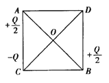 4、选择题 如图所示,在A、B、C、D四点是一正方形的四个顶点,O是两对角线的交点。A、B两点放有等量同种点电荷+Q/2,在C点有点电荷-Q,则有