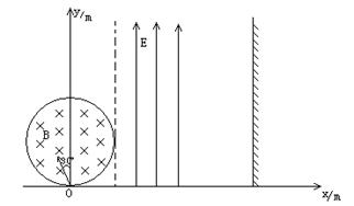 2、计算题 如图所示,真空有一个半径r="0.5" m的圆形磁场,与坐标原点相切,磁场的磁感应强度大小B=2×10-3 T,方向垂直于纸面向里,在x=r处的虚线右侧有一个方向竖直向上的宽度为L1="0.5" m的匀强电场区域,电场强度E=1.5×103 N/C。在x="2" m处有一垂直x方向的足够长的荧光屏,从O点处向不同方向发射出速率相同的荷质比=1×109 C/kg带正电的粒子,粒子的运动轨迹在纸面内,一个速度方向沿y轴正方向射入磁场的粒子,恰能从磁场与电场的相切处进入电场。不计重力及阻力的作用。求: