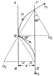 3、计算题 如图所示,在空间中存在垂直纸面向里的场强为B匀强磁场,其边界AB、CD的宽度为d,在左边界的Q点处有一质量为m,带电量为负q的粒子沿与左边界成30°的方向射入磁场,粒子重力不计。求:
