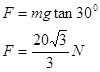 4、计算题 (10分)如图所示,AB、BC均为轻细杆,处在同一竖直平面内,AB杆高为h=0.8m。A、B、C三处均用铰接连接,其中A、C两点在同一水平面上,BC杆与水平面夹角为30°。一个质量为m=2kg的小球(可视为质点)穿在BC杆上,对小球施加一个水平向左的恒力F使小球静止在BC杆中点处,不计一切摩擦。(g取10m/s2),求: