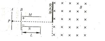 2、计算题 (18分)如图所示,位于A板附近的放射源P连续释放出质量分别为m和2m、电荷量均为+q的a、b两种粒子,它们从静止开始经极板A、B间电场加速后,沿中心轴线方向进入平行极板M、N间的偏转电场,飞出偏转电场后进入右侧的有界匀强磁场,最后打在位于磁场边界上的荧光屏上并产生光斑(荧光屏的下端位于中心轴线上).已知A、B问电压为;极板M、N长为L,间距为