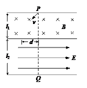 1、计算题 如图,在宽度分别为l1和l2的两个毗邻的条形区域内分别有匀强磁场和匀强电场,磁场方向垂直于纸面向里,电场方向与电、磁场分界线平行向右。一带正电荷的粒子以速率v从磁场区域上边界的P点斜射入磁场,然后以垂直于电、磁场分界线的方向进入电场,最后从电场边界上的Q点射出。已知PQ垂直于电场方向,粒子轨迹与电、磁场分界线的交点到PQ的距离为d。不计重力,求电场强度与磁感应强度大小之比以及粒子在磁场与电场中运动时间之比。