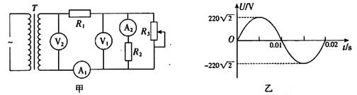 2、选择题 如图甲所示,T为理想变压器,原、副线圈匝数比为10:1,副线圈所接电路中.电压表V1、V2和电流表A1、A2都为理想电表,电阻R1 =4