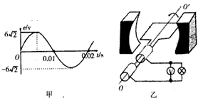 5、选择题 图乙为一台小型发电机构造示意图,线圈逆时针转动,产生的电动势随时间变化的正弦规律图象如图甲所示。发电机线圈内阻为1.0 Ω,外接灯泡的电阻为9.0 Ω,则