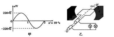 2、选择题 一台小型发电机产生的电动势随时间变化的正弦规律图像如图甲所示。已知发电机线圈内阻为5.0Ω,现外接一只电阻为95.0Ω的灯泡,如图乙所示,则