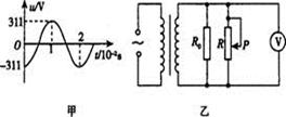1、选择题 一交流电路如图甲所示,电阻R=10Ω。交流电源输出的电压u随时间t变化的图线如图乙所示,闭合开关S后
