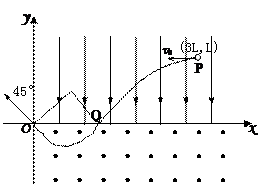 4、简答题  如图所示,在xOy坐标平面的第一象限内有一沿-y方向的匀强电场,在第四象限内有一垂直于平面向外的匀强磁场。现有一质量为m,带电量为+q的粒子(重力不计)以初速度v0沿-x方向从坐标为(3L,L)的P点开始运动,接着进入磁场后由坐标原点O射出,射出时速度方向与y轴方向的夹角为45°,求: