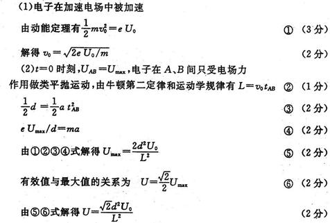 4、简答题 右下图为示波器的部分构造示意图,真空室中阴极K不断发出初速度可忽略的电子,电子经电压为U0的电场加速后,由孔N沿长为I、相距为d的两平行金属板A、B间的中心轴线进入两板间,电子穿过A、B后最终可打在中心为O的荧光屏CD上。若在AB间加上变化规律为
