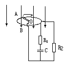 3、计算题 如图所示,在磁感强度B= 2T的匀强磁场中,有一个半径r=0.5m的金属圆环。圆环所在的平面与磁感线垂直。OA是一个金属棒,它沿着顺时针方向以20rad/s的角速度绕圆心O匀速转动。A端始终与圆环相接触OA棒的电阻R=0.1Ω,图中定值电阻R1=100Ω,R2=4.9Ω,电容器的电容C=100pF。圆环和连接导线的电阻忽略不计,求: