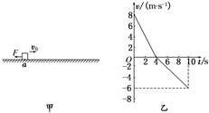3、计算题 (12分)如图甲所示,质量m=2 kg的物体在水平面上向右做直线运动。过a点时给物体作用一个水平向左的恒力F并开始计时,选水平向右为速度的正方向,通过速度传感器测出物体的瞬时速度,所得v-t图象如图乙所示。取重力加速度g=10 m/s2。求:
