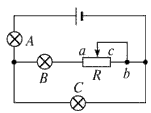 3、选择题 如图所示,A、B、C是相同的三盏灯,在滑动变阻器的滑动触头由c端向b端滑动的过程中(各灯都不被烧坏),各灯亮度的变化情况为