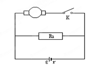1、计算题 如图所示,电阻R1=8Ω,电动机绕组电阻R0=2Ω,当电键K断开时,电阻R1消耗的电功率是2.88W;当电键闭合时,电阻R1消耗的电功率是2W,电动机刚好正常工作。若电源的电动势为6V。求: