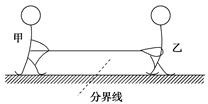 4、选择题 如图所示,一个大人(甲)跟一个小孩(乙)站在水平地面上手拉手比力气,结果大人把小孩拉过来了.对这个过程中作用于双方的力的关系,下列说法不正确的是(? )