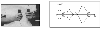 5、选择题  用计算机辅助实验系统做验证牛顿第三定律的实验,点击实验菜单中“力的相互作用”.如图(a)所示,把两个力探头的挂钩钩在一起,向相反方向拉动,观察显示器屏幕上出现的结果图(b).观察分析两个力传感器的相互作用力随时间变化的曲线,可以得到以下实验结论( )