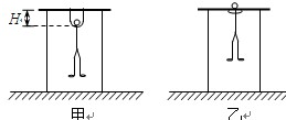 1、计算题 “引体向上”是同学们常做的一项健身运动。如图甲所示,质量为m=50kg的某同学两手正握单杠,手臂完全伸直,身体呈自然悬垂状态,此时他的下颚距单杠的高度为H=0.4 m,然后他用F=600 N的恒力将身体向上拉至某位置时不再用力,身体依靠惯性继续向上运动,为保证其下颚超过单杠达到合格要求,如图乙所示。恒力F的作用时间至少为多少?不计空气阻力,取重力加速度g=10 m/s2。