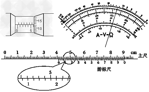 1、实验题 下图中给出的螺旋测微器读数为______mm;游标卡尺读数为______mm;图中的多用电表表盘:如果用×100Ω档测量电阻,读数为_______Ω;如果用直流10 mA档测量电流,读数为_______mA;如果用直流5 V档测量电压,读数为_______V。