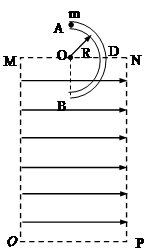 2、计算题 (16分)如图所示:矩形区域MNPQ内有水平向右的匀强电场,虚线框外为真空区域;半径为、内壁光滑、内径很小的绝缘半圆管ADB固定在竖直平面内,直径AB垂直于水平虚线MN,圆心O为MN的中点,半圆管的一半处于电场中。一带正电的小球从半圆管的A点由静止开始滑入管内,小球可视为质点,质量为