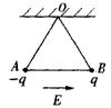 3、计算题 有三根长度皆为l=1.00 m的不可伸长的绝缘轻线,其中两根的一端固定在天花板上的O点,另一端分别挂有质量皆为m=1.00×10-2 kg的带电小球A和B,它们的电量分别为一q和+q,q=1.00×10-7 C。A、B之间用第三根线连接起来。空间中存在大小为E=1.00×106N/C的匀强电场,场强方向沿水平向右,平衡时 A、B球的位置如图所示。现将O、B之间的线烧断,由于有空气阻力,A、B球最后会达到新的平衡位置。求最后两球的机械能与电势能的总和与烧断前相比改变了多少。(不计两带电小球间相互作用的静电力)