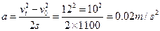 2、简答题 一辆小汽车通过长1100米的隧道,小汽车刚进隧道时的速度是10m/s,出隧道时的速度是12m/s,(小汽车可看成质点)求:小汽车过隧道时的加速度是多大?