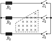1、选择题 如图所示电路中,均匀变化的匀强磁场只存在于虚线框内,三个电阻阻值之比