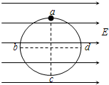 3、填空题 (10分)如图所示,一半径为R的光滑圆环,竖直放在水平向右的的匀强电场中,匀强电场的电场强度大小为E。环上a、c是竖直直径的两端,b、d是水平直径的两端,质量为m的带电小球套在圆环上,并可沿环无摩擦滑动,已知小球自a点由静止释放,沿abc运动到d点时速度恰好为零,由此可知小球所受重力?(选填“大于”、“小于”或“等于”)带电小球所受的静电力。小球在?(选填“a”、“b”、“c”或“d”)点时的电势能最小。