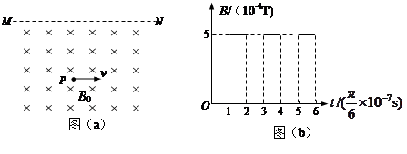 2、计算题  (16分)如图(a)所示,垂直于纸面向里的有界匀强磁场,MN是磁场的上边界,磁场宽度足够大,磁感应强度B0=1×10-4T.现有一比荷为=2×1011C/kg的正离子以某一速度从P点水平向右射入磁场,已知P点到边界MN的垂直距离d=20cm,不计离子的重力,试求: