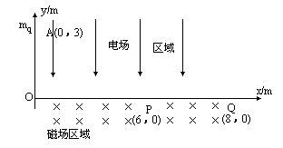 1、简答题 如图所示,在直角坐标xoy的第一象限中分布着指向-y轴方向的匀强电场,在第四象限中分布着垂直纸面向里方向的匀强磁场,一个质量为m、带电+q的粒子(不计重力)在A点(0,3)以初速V0=120m/s平行x轴射入电场区域,然后从电场区域进入磁场,又从磁场进入电场,并且只通过x轴上的P点(6,0)和Q点(8,0)各一次,已知该粒子的荷质比为q/m=108c/kg.