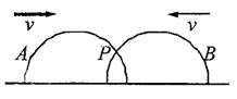 3、选择题 如图所示,A、B为半径相同的两个半圆环,以大小相同、方向相反的速度运动,A环向右,B环向左,则从两半圆环开始相交到最后分离的过程中,两环交点P的速度方向和大小变化为(? )