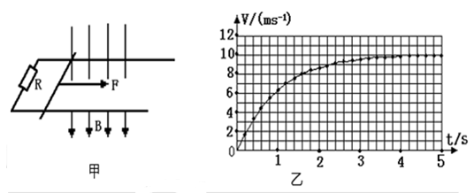 4、计算题 (12分)如图甲所示,放置在水平桌面上的两条光滑导轨间的距离L=1m,质量m=1kg的光滑导体棒放在导轨上,导轨左端与阻值R=4Ω的电阻相连,导体棒及导轨的电阻不计,所在位置有磁感应强度为B=2T的匀强磁场,磁场的方向垂直导轨平面向下。现在给导体棒施加一个水平向右的恒定拉力F,并每隔0.2s测量一次导体棒的速度,乙图是根据所测数据描绘出导体棒的v-t图象。设导轨足够长,求: