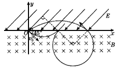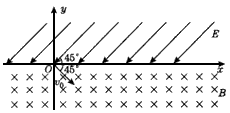 3、计算题  如图所示,x轴的上方存在方向与x轴成45°角的匀强电场,电场强度为E,x轴的下方存在垂直纸面向里的匀强磁场,磁感应强度B=0.5 T。有一个质量m=10-11 kg,电荷量q=10-7 C的带正电粒子,该粒子的初速度v0=2×103 m/s,从坐标原点O沿与x轴成45°角的方向进入匀强磁场,经过磁场和电场的作用,粒子从O点出发后第四次经过x轴时刚好又回到O点处,设电场和磁场的区域足够宽,不计粒子重力,求: