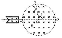 1、计算题  (14分)如图所示,图中左边有一对平行金属板,两板相距为d,电压为U。两板之间有匀强磁场,磁感应强度大小为B0,方向与金属板面平行并垂直于纸面朝里;图中右边有一半径为R、圆心为O的圆形区域,区域内也存在匀强磁场,磁感应强度大小为B,方向垂直于纸面朝里。一电荷量为q的正离子沿平行于金属板面、垂直于磁场的方向射入平行金属板之间,沿同一方向射出平行金属板之间的区域,并沿直径PQ方向射入磁场区域,最后从圆形区域边界上的G点射出,已知弧QG所对应的圆心角为。离子重力不计。求: