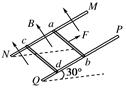 1、计算题 如图所示,两根足够长的光滑平行金属导轨MN、PQ间距为l=0.5 m,其电阻不计,两导轨及其构成的平面均与水平面成30°角.完全相同的两金属棒ab、cd分别垂直导轨放置,每棒两端都与导轨始终有良好接触,已知两棒质量均为m=0.02 kg,电阻均为R=0.1 Ω,整个装置处在垂直于导轨平面向上的匀强磁场中,磁感应强度B=0.2 T,棒ab在平行于导轨向上的力F作用下,沿导轨向上匀速运动,而棒cd恰好能够保持静止.取g=10 m/s2,问: