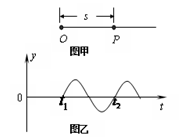 3、选择题  如图甲所示为一水平弹性细绳,O点为振源,OP = s,t = 0时刻O点由平衡位置开始振动,产生向右沿直线传播的简谐横波。图乙为从t = 0时刻开始描绘的质点P的振动图象。下列判断中正确的是