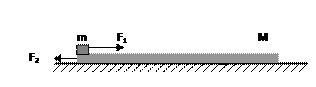 3、简答题 如图所示,质量为M=4kg的木板放置在光滑的水平面上,其左端放置着一质量为m=2kg的滑块(视作质点),某时刻起同时给二者施以反向的力,如图,已知F1=6N,F2=3N,