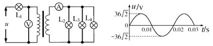 5、选择题 如下左图所示,变压器原副线圈的匝数比为3:1,L1、L2、L3、L4为四只规格均为“9V,6W”的相同灯泡,各电表均为理想交流电表,输入端交变电压u的图象如下右图所示.则以下说法中正确的是(?)