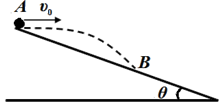 1、计算题  (11分)某战士在倾角θ = 30°的山坡上进行投掷手榴弹训练。他从A点以某一初速度υ0沿水平方向投出手榴弹,正好落在B点,测得AB = 90m。设空气阻力不计,取重力加速度g = 10m/s2。