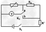 =15Ω,K2为单刀双掷开关。闭合S1,将K2切换到a端,调节电阻箱,读出其阻值为R1,记录“数字式理想电压表”测得的数据为U1;然后保持电阻箱的阻值不变,将K1切换到b端,记录“数字式理想电压表”测得的数据为U2。  ?