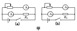 (1)某同学发现上述器材中虽然没有电压表,但给出了两个电流表,于是他设计了如图所示中甲的(a)、(b)两个参考实验电路,其中合理的是____________图所示的电路;在该电路中,为了操作方便且能准确地进行测量,滑动变阻器应选____________(填写器材前的字母代号)。