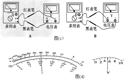 (3)某同学想通过另一个多用电表中的欧姆挡,直接去测量某电压表(量程10?V)的内阻(大约为几十千欧),由该多用电表刻度盘上读出电阻刻度中间值为30,欧姆挡的选择开关拨至倍率______挡.先将红、黑表笔短接调零后,选用图(c)中________(填“A”或“B”)方式连接.在本实验中,如图(d)所示,某同学读出欧姆表的读数为________Ω,这时电压表的读数为________V.请你求出欧姆表电池的电动势为________V。