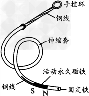 参考答案:(1)当仪器的顶部接触到金属物品,手控环内推,使活动永久磁铁与仪器顶部的固定铁接触,使其磁化,固定铁具有磁性,吸引金属物品,再拉出整条塑料管就可把金属物品取出.