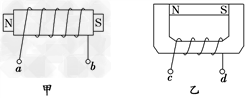 1、选择题 磁铁放久了,其磁性将变弱,为了保持其磁性,我们需要给磁铁充磁,充磁的方式有两种.图甲是将条形磁铁穿在通电螺线管中,图乙是将条形磁铁夹在电磁铁之间,a、b和c、d接直流电源,下列接线正确的是