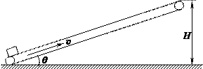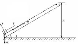 4、简答题 如图所示,某货物仓库,需将生产成品用传送带从底端传递到高度为H的高处存放,货物从静止开始轻放到传送带的最下端,已知货物与传送带间的动摩擦因数为μ=,传送带始终保持恒定速度运动。若想用最短时间将货物匀加速的运送至顶端,则传送带与水平面夹角θ应设计为多大?最短时间为多少?(传送带长度可随设计需要而变化,g=10m/s2)